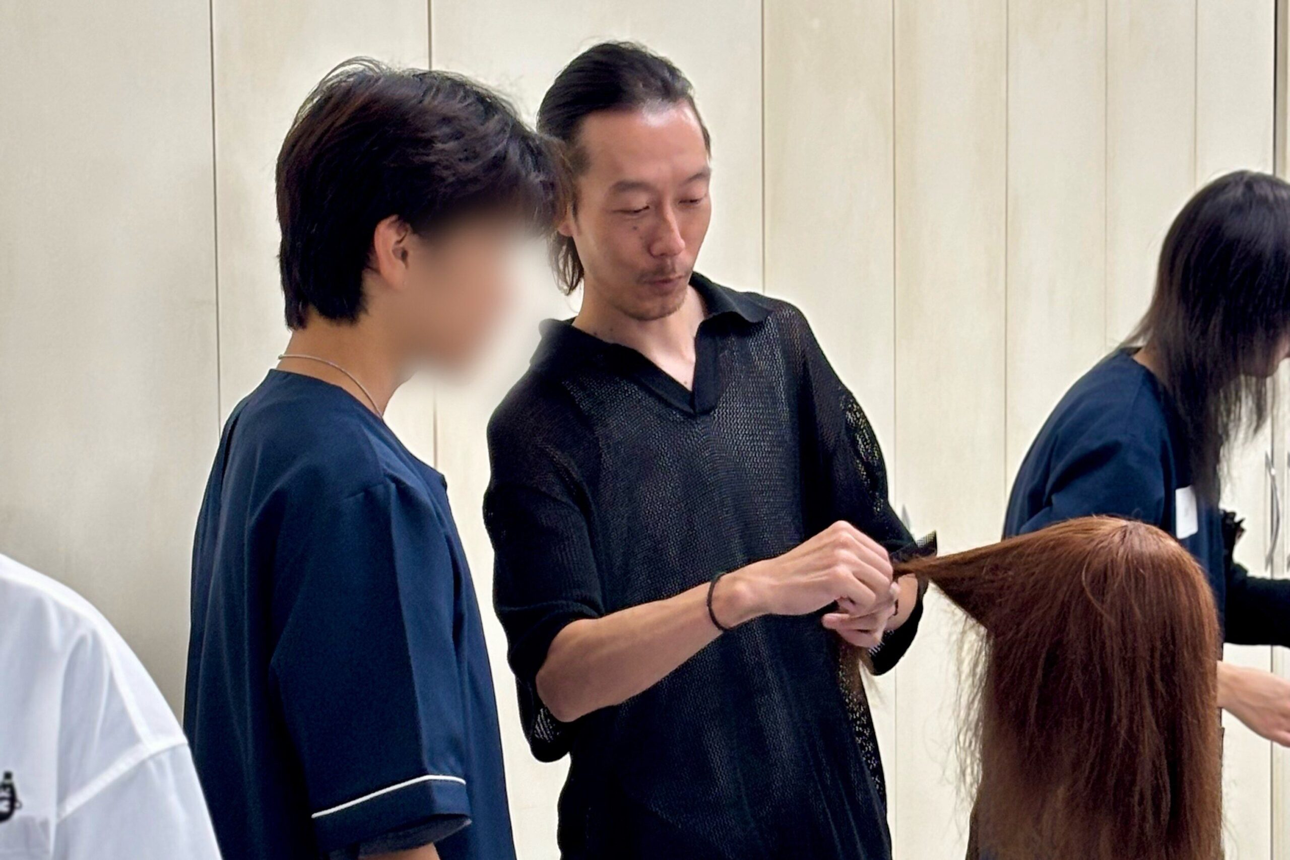 今回は講師アシスタントとして、渋谷美容専門学校卒業生であり現在は海老名店スタイリストとして大活躍中の佐々木レオナさんも一緒に参加いただきました。